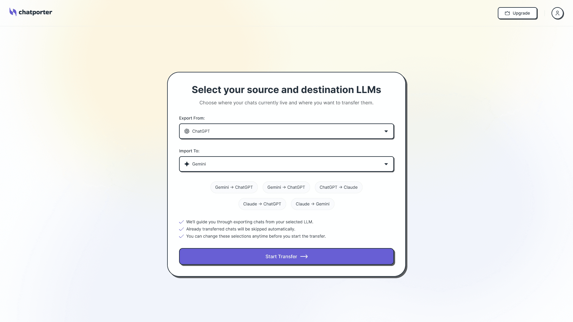 The easiest way to transfer your chats from one LLM to another. Sign up for access!